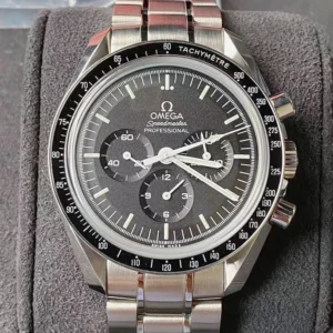 The black step dial features familiar Moonwatch hands, a vintage OMEGA logo, as well as a small seconds sub-dial, 30-minute recorder and 12-hour recorder along with a central chronograph hand. Through the sapphire-crystal caseback, you can see the Calibre 321 inside.