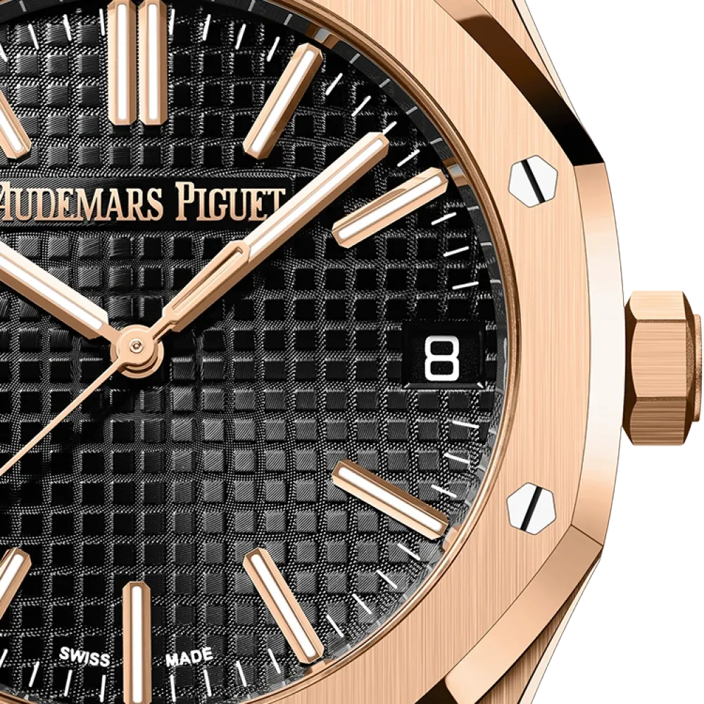 Black dial with “Grande Tapisserie” pattern, pink gold applied hour-markers and Royal Oak hands with luminescent coating.